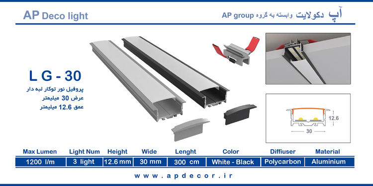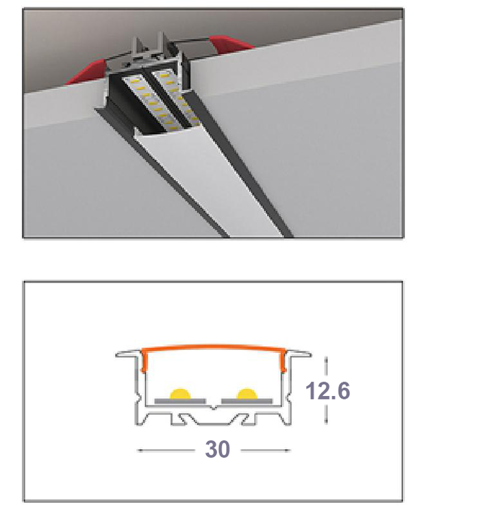 چراغ خطی توکار 30 میل گیره دار کد LT - 30 شاخه 3 متری با دیفیوزر